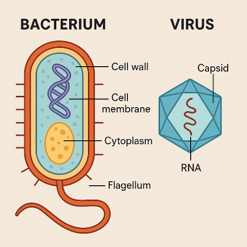 기본 구조 | 세포막(cell membrane), 세포벽(cell wall), 세포질(cytoplasm), DNA | 유전물질(DNA 또는 RNA) + 단백질 껍질(capsid) |