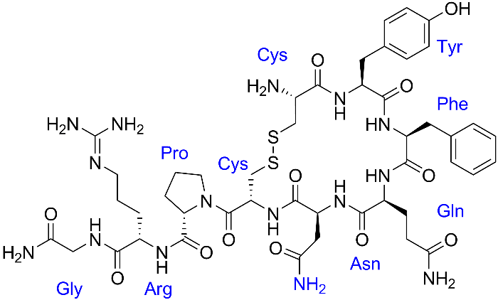 바소프레신(Vasopressin)은 아홉 개의 아미노산으로 구성된 펩타이드 호르몬으로, 두 개의 시스테인(Cys) 잔기 사이에 이황화 결합(disulfide bond)이 형성되어 고리 구조를 이루고 있습니다. 이 구조는 바소프레신의 생리적 기능과 안정성에 중요한 역할을 합니다.
