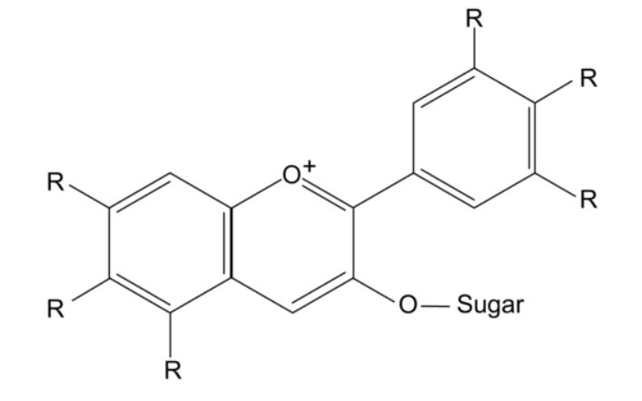 안토시아닌이 다양한 색을 내는 이유는 주변 pH에 따라 다르다. 방향족 오른쪽에 붙어 있는 수산화기의 개수에 따라 색이 다르게 나타난다.