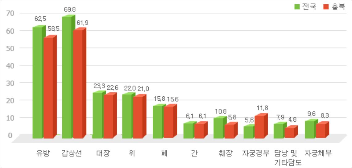 여성의 암 발병률은 호르몬과 더불어 음식 관련 암이 뒤 따르고 있습니다. 유방암도 음식와 인과관계가 높기 때문에 최근들어 발병하는 암은 대체로 음식관 관련이 높습니다. 그만큼 현대인의 음식문화가 좋지 않다는 것을 확인할 수 있습니다.