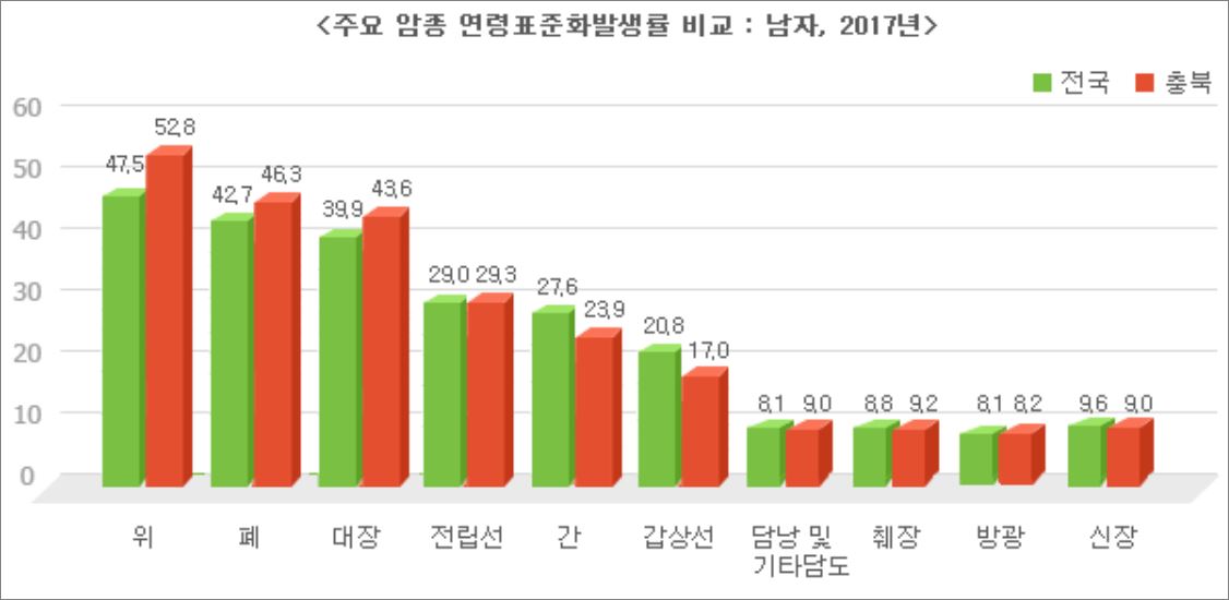 남성들이 주로 걸리는 암은 위, 폐, 대장,간,췌장 등의 음식과 관련된 암이 많은 것을 알 수 있습니다. 술과 흡연으로 인해 암 발생률이 높다는 것을 알 수 있고, 외식이 많아 지면서 소화기 관련 암이 많습니다.