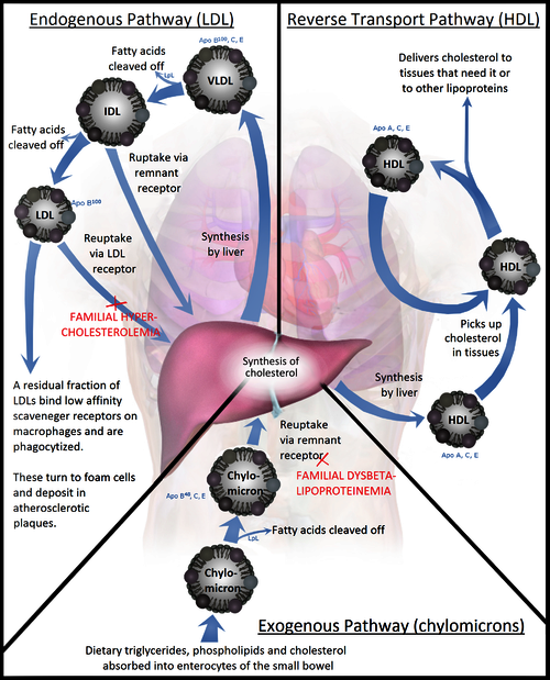 간은 에너지원이나 글리코겐 합성에 이용하고 남은 포도당으로 중성지방을 합성한다. 주로 포화지방산으로부터 콜레스테롤을 합성한다. 콜레스테롤과 인지질, 내인성중성지방과 함께 VIDL을 형성한다. 이는 다시 근육이나 지방조직에서 지단밴질 지질분해효소에 의해 지방산으로 분해되어 조직세포 안으로 들어간다.