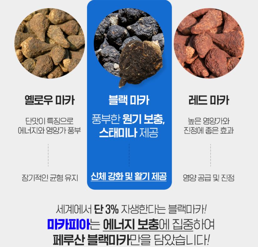 마카는 예로부터 널리 알려진 남성 활성제이다. 먹으면 기운이 나고 혈액순환에 좋다고 한다. 마카는 옐로우, 레드, 블랙 세종류가 있다. 옐로우 마카는 가장 일반적인 식품으로 단맛이 나고 많은 에너지영양가가 풍부하다. 레드마카는 다른 마카에 비해 영영가가 높으며, 진정효과가 높다. 마지막으로 블랙마카는 가장 고가이며 적다. 몸의 활력을 높이고, 혈액 순환에 좋다고 한다. 예로부터 생식능력 증진에 효과가 있다고 한다. 2016년 이명수에 의하면 불임남성의 정액의 질을 높인다는 연구보고가 있다. 아직 많은 연구가 이루어지지는 않았지만 나름 의미있는 연구이다. 2016년 파주에서는 '안데스의 산삼, 마카 재배 추진'이란 기사가 나오기도 했다.